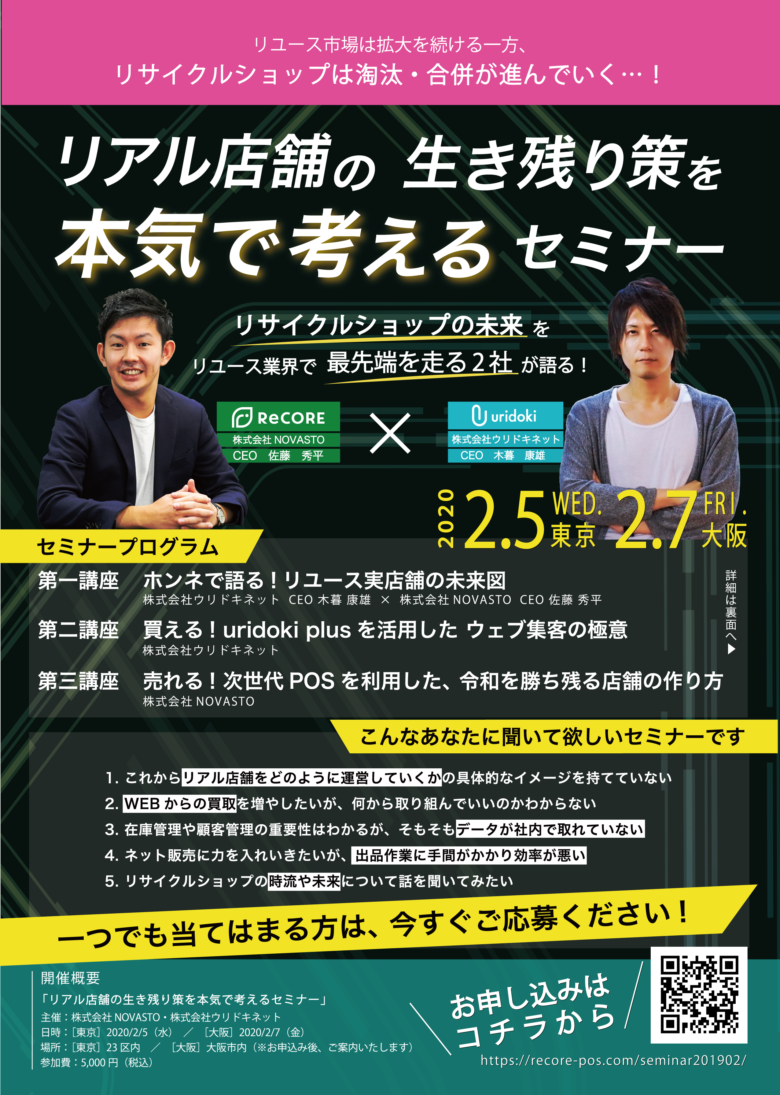今回のセミナーでは、時流に乗った店舗運営方法や、WEBを利用した買取や販売のヒントなどを、リユース業界の最先端を走る2社のCEOが語ります。