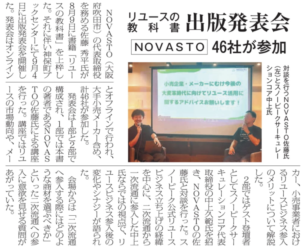 2024年9月25日号のリユース経済新聞に、先日行われた代表の著書、「リユースビジネスの教科書」発売記念イベントについての記事を掲載いただきました。