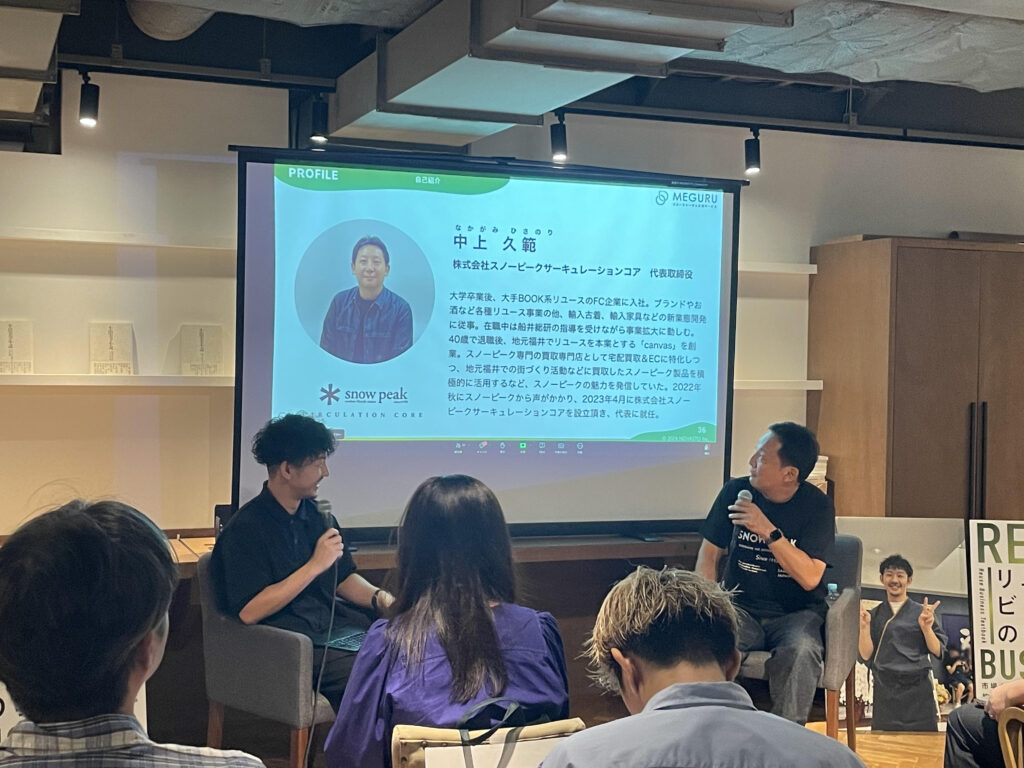 書籍内でもメーカーのリユース参入事例として紹介させていただ、スノーピークサーキュレーションコアの中上代表をゲストにお迎えし、お客様との質疑応答も交えながら、2時間に渡りお話しさせていただきました。